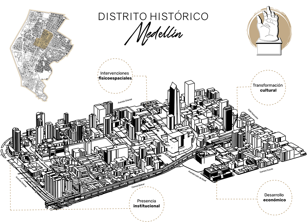 Desde las entidades gestoras, se han propuesto cuatro dimensiones en las que crecerá el proyecto del Distrito Histórico de Medellín. Por una parte, desde el componente físico – espacial se podrán planificar y gestionar de manera armoniosa los recursos urbanísticos y naturales del centro, para brindar a los habitantes de todas las edades la posibilidad de ocupar plenamente su ciudad y aprovechar toda su potencialidad con relación al patrimonio, el espacio público, y la oferta institucional, a través de acciones de revitalización de los usos, de una manera participativa y con planeación democrática..