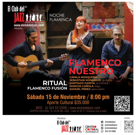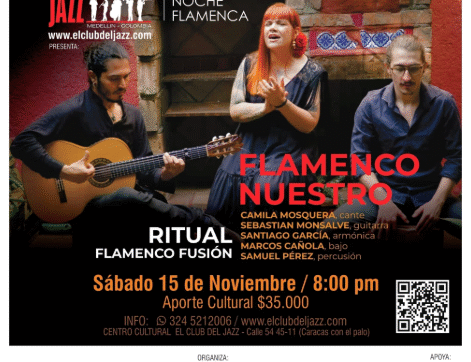 Déjate envolver por el apasionado cante de Maria Camila Mosquera, que con su voz llena de fuerza y sentimiento, revive las raíces más profundas de este arte. Acompañándola, la energía rítmica de Samuel Pérez en batería y percusión marca el pulso de cada interpretación, mientras las cuerdas magistrales de Sebastián Monsalve en guitarra te llevan por paisajes sonoros inolvidables.
