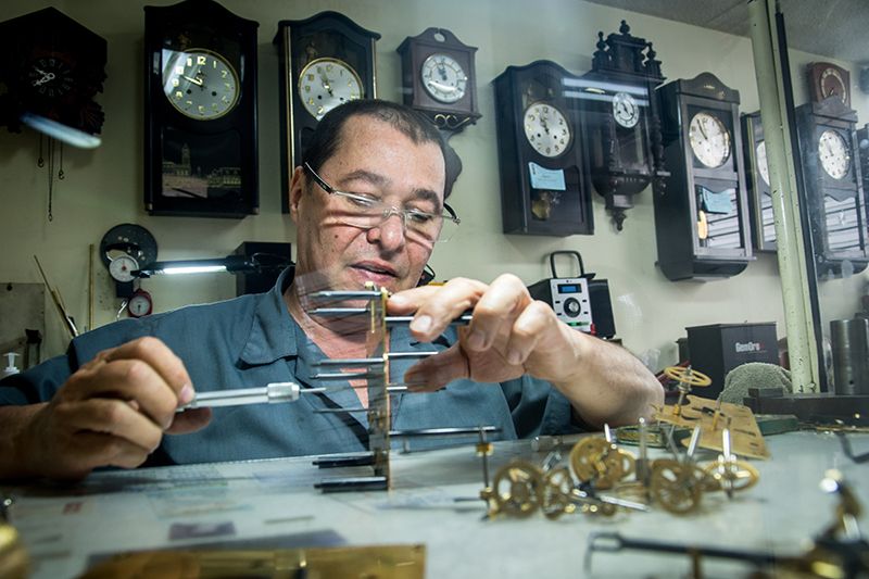 Alonso Berrío, todos los días, desde hace 50 años, llega a su negocio en la calle Maturín, muy cerca de la estación San Antonio del Metro y con extrema precisión se encarga de devolverle su curso a cualquier reloj.